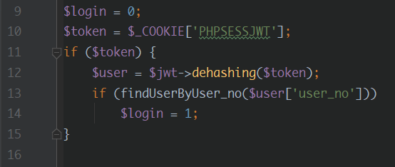core.php에 보면 다음과 같은 세션 확인 코드가 있다. PHPSESSJWT라는 쿠키에서 JWT 코드를 넘겨받아 저장하여 유저인지 확인하는 부분이다.