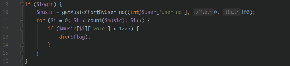 해당 코드는 유저가 업로드한 음악 중에 투표수가 1225를 넘는 음악이 있다면 플래그를 뱉도록 하는 부분이다.