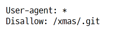 CTF를 할 때마다 웹해킹 문제를 풀려면 어쩔 수 없이 확인해야하는 것이 1. /robots.txt 2. /.git/ 3. /admin/ 등이다. 이 문제에서는 1, 2번만 확인해도 풀 수 있도록 설계했다. robots.txt 에 들어가보면 아래와 같이 뜨는 것을 볼 수 있다. 원래 '신내림은 웹해커의 가장 본질적인 능력이다'라는 생각으로 robots.txt에 힌트를 주지 않으려고 했지만, 이러한 신내림 능력이 아직 부족하신 분들이 괜히 크리스마스 때 고생하지 않도록 힌트를 넣었다. (참고로, /.git/ 디렉토리로의 접근을 통해 소스코드의 일부를 유출할 수 있는 취약점은 리얼월드에서도 간간히 보인다.)