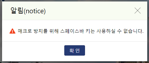 msgAlert("매크로 방지를 위해 스페이스바 키는 사용하실 수 없습니다.");