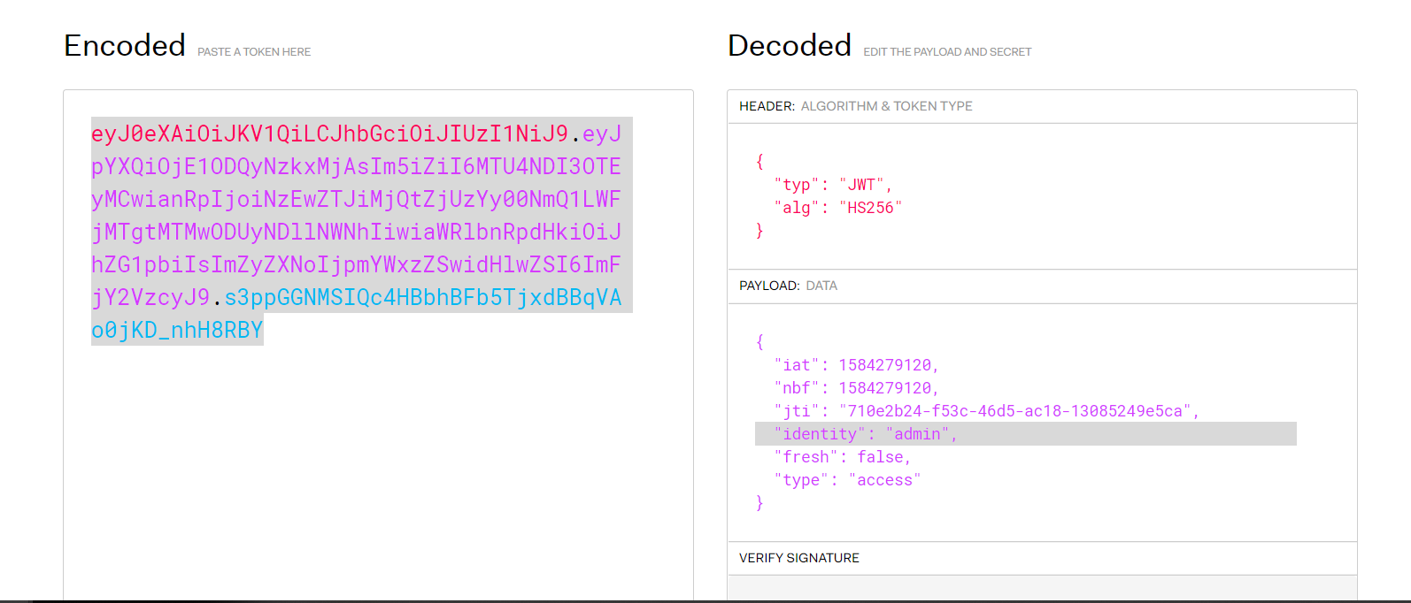 [*] payload : eyJ0eXAiOiJKV1QiLCJhbGciOiJIUzI1NiJ9.eyJpYXQiOjE1ODQyNzkxMjAsIm5iZiI6MTU4NDI3OTEyMCwianRpIjoiNzEwZTJiMjQtZjUzYy00NmQ1LWFjMTgtMTMwODUyNDllNWNhIiwiaWRlbnRpdHkiOiJhZG1pbiIsImZyZXNoIjpmYWxzZSwidHlwZSI6ImFjY2VzcyJ9.s3ppGGNMSIQc4HBbhBFb5TjxdBBqVAo0jKD_nhH8RBY