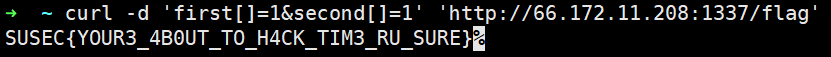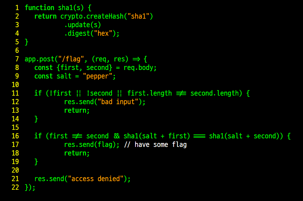 We can get the source which use nodejs express engine. There's some mechanism which compare 'first' and 'second' in post method. As send Array in 'first' and 'second', you can get the flag!
