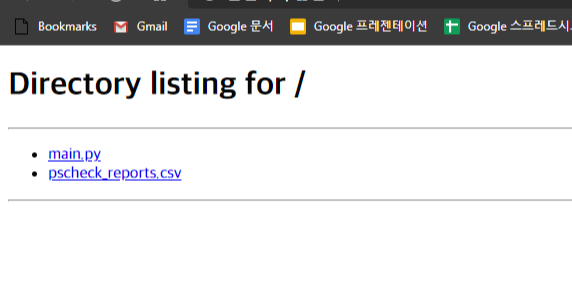 확인해보니 pscheck_reports.csv 에는 사용자의 행위로그가 csv 형식으로 저장되어 있었다. main.py는 해당 서버를 구동시키는 소스였다. 해당 웹 서버는 Python의 SimpleHTTPSever를 사용한다. 서버에서는 사용자의 입력을 HTTP Request로 받아들여 pscheck_reports.csv 파일에 저장한다.