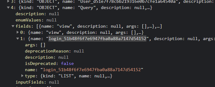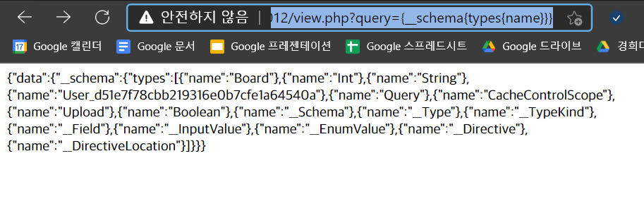 webhacking.kr:10012/view.php?query=query {__schema{queryType{name},mutationType{name},types{kind,name,description,fields(includeDeprecated:true){name,description,args{name,description,type{kind,name,ofType{kind,name,ofType{kind,name,ofType{kind,name,ofType{kind,name,ofType{kind,name,ofType{kind,name,ofType{kind,name}}}}}}}},defaultValue},type{kind,name,ofType{kind,name,ofType{kind,name,ofType{kind,name,ofType{kind,name,ofType{kind,name,ofType{kind,name,ofType{kind,name}}}}}}}},isDeprecated,deprecationReason},inputFields{name,description,type{kind,name,ofType{kind,name,ofType{kind,name,ofType{kind,name,ofType{kind,name,ofType{kind,name,ofType{kind,name,ofType{kind,name}}}}}}}},defaultValue},interfaces{kind,name,ofType{kind,name,ofType{kind,name,ofType{kind,name,ofType{kind,name,ofType{kind,name,ofType{kind,name,ofType{kind,name}}}}}}}},enumValues(includeDeprecated:true){name,description,isDeprecated,deprecationReason,},possibleTypes{kind,name,ofType{kind,name,ofType{kind,name,ofType{kind,name,ofType{kind,name,ofType{kind,name,ofType{kind,name,ofType{kind,name}}}}}}}}},directives{name,description,locations,args{name,description,type{kind,name,ofType{kind,name,ofType{kind,name,ofType{kind,name,ofType{kind,name,ofType{kind,name,ofType{kind,name,ofType{kind,name}}}}}}}},defaultValue}}}}