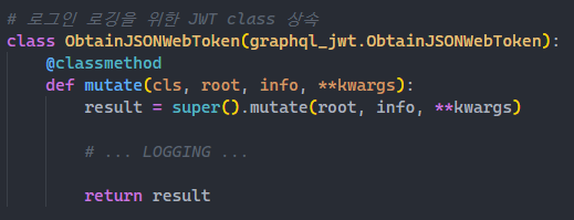 - graphql_jwt.ObtainJSONWebToken 클래스를 상속받아서 로그인하는 코드를 실행한 뒤 별도의 로깅 코드를 실행한다.