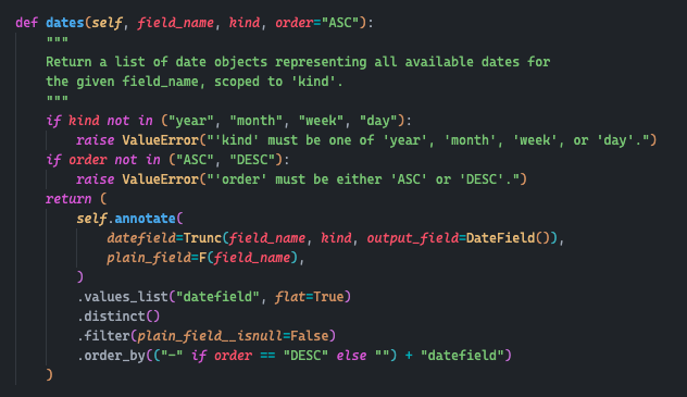 이 취약점의 시작은 `QuerySet` 클래스의 `dates()` 메소드로부터 시작한다.