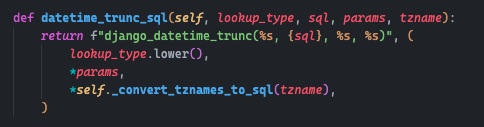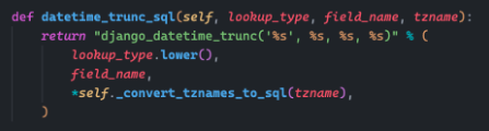 `django/db/models/functions/datetime.py`에 정의된 `Trunc` 클래스는 `TruncBase` 클래스를 상속받은 형태로, 실질적으로 ORM에서 SQL 쿼리로 변환하는 기능은 `TruncBase` 클래스의 `as_sql()` 메소드로 정의되어 있다. 이는 인자로 넘겨진 `output_field`를 확인하고 변수의 유형별로`datetime_trunc_sql()`, `date_trunc_sql()`, `time_trunc_sql()` 메소드를 호출한다. 이 세 가지의 메소드는 각 DBMS별 문법에 따라 각각 정의되어 있으며, SQLite3를 예시로 들어 설명하자면 아래와 같이 정의되어 있다.