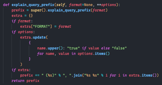- BaseDatabaseOperatios의 explain_query_prefix() 메소드는 크게 하는 역할이 없다. 인자로 전달된 format, options의 값을 검사하는데 format의 경우 기본적으로 설정되어 있지 않아 format 값을 지정할 수 없고, options는 그냥 값이 존재한다면 ValueError를 raise한다.