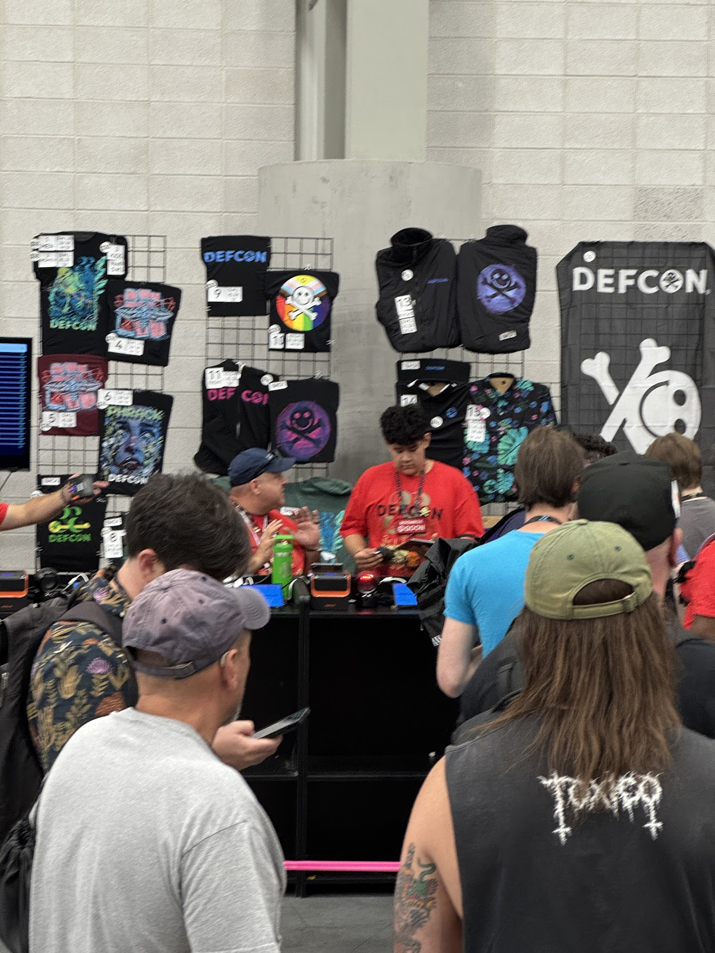 그리고 랩실 분들은 Aerospace villiage에서 GMO Ierae 분들과 협력하여 연구한 내용을 바탕으로 부스를 운영하고, 저는 같이 온 친구와 함께 DEF CON 머챈다이즈 샵에 갔다왔습니다. 이 날은 컨퍼런스가 공식적으로 시작되기 전날이라 구경할 만한 부스가 없어서 다들 merchandise shop에 몰린 것 같더라구요. 데프콘 굿즈 사는 데에 3시간 정도 기다렸습니다.