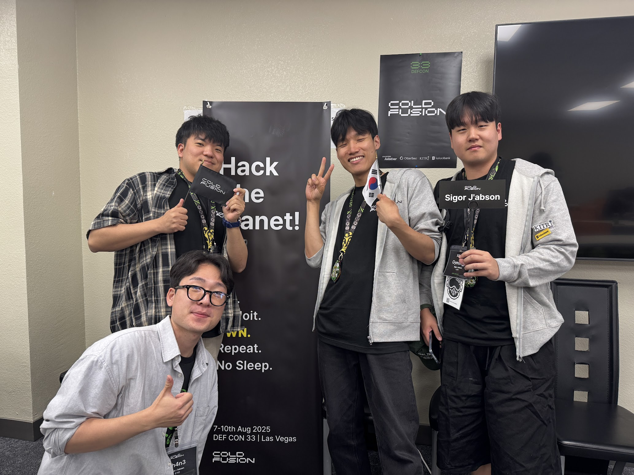 함께 해주신 Cold Fusion 팀원 분들 모두 수고 많으셨습니다! 저는 사실 아무것도 기여한 것은 없었지만, 많은 것을 보고 느꼈던 대회였던 것 같습니다. DEF CON 33 CTF 후기는 아래 제 기술 블로그에 작성해두었습니다.
