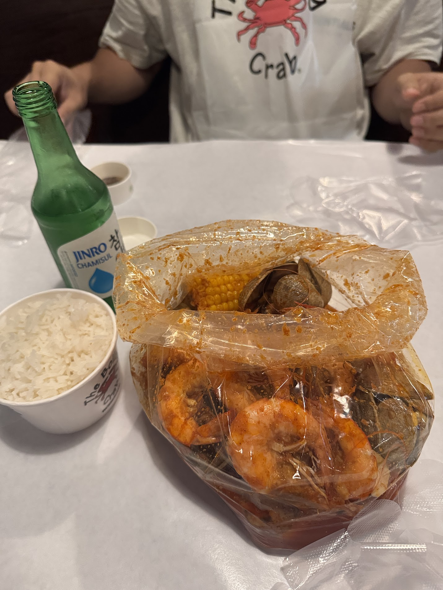 보일링 시푸드 집에 왔습니다. The Boiling Crab 이라는 가게였고, 한인타운 근처에 있어서 소주도 있길래 같이 시켜보았습니다. 진짜 참고로 너무 맛있었습니다. 999/10점. 소스가 정말 자극적이라 밥이 그냥 쑥쑥 넘어갑니다.