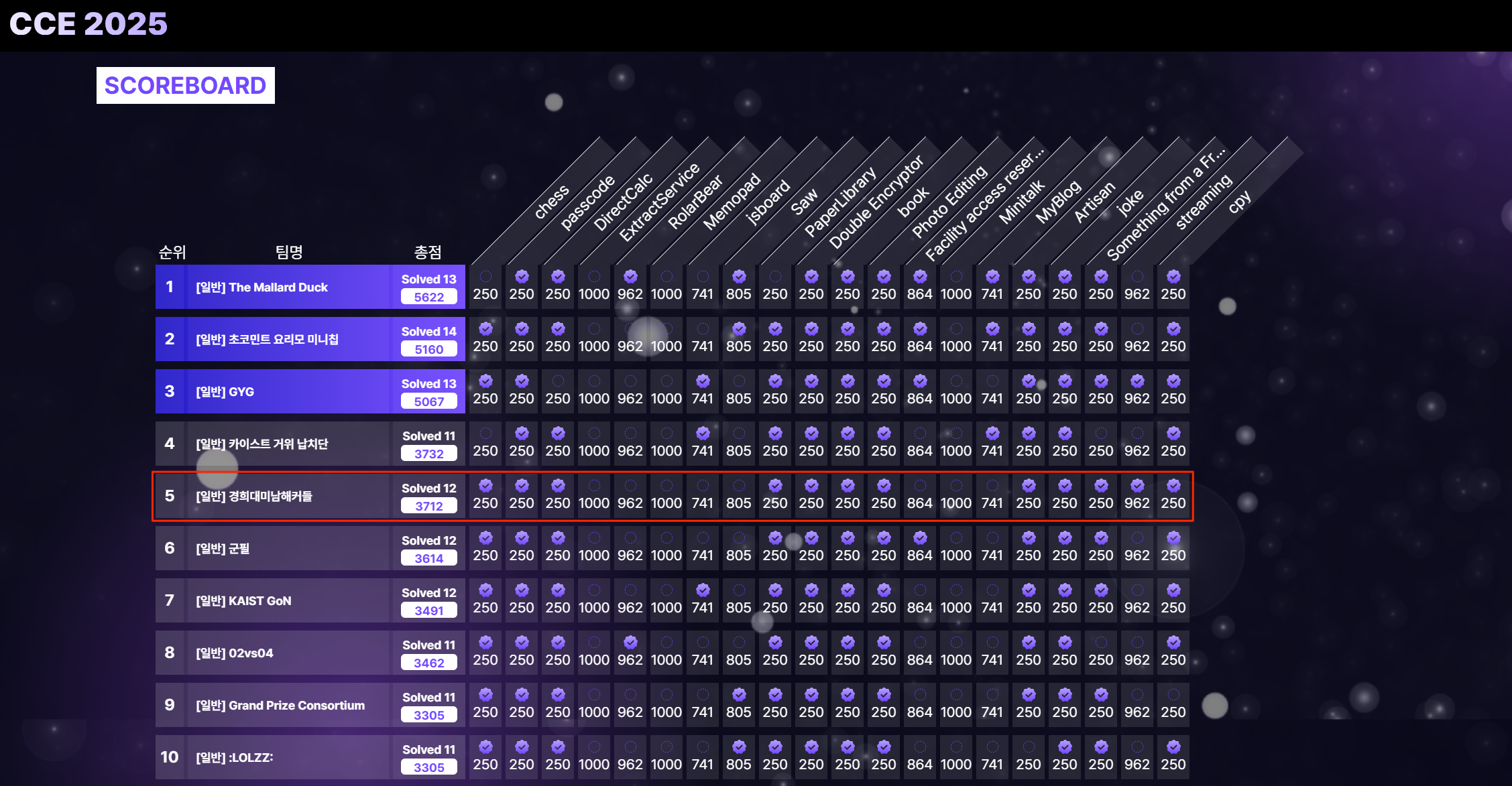팀원들의 미친 캐리로 CCE 2025에서 예선 5위로, 본선에 진출하게 되었습니다. 개인적으로는 첫 메이저 대회 '일반부' 본선 진출이라 감회가 새로웠습니다.