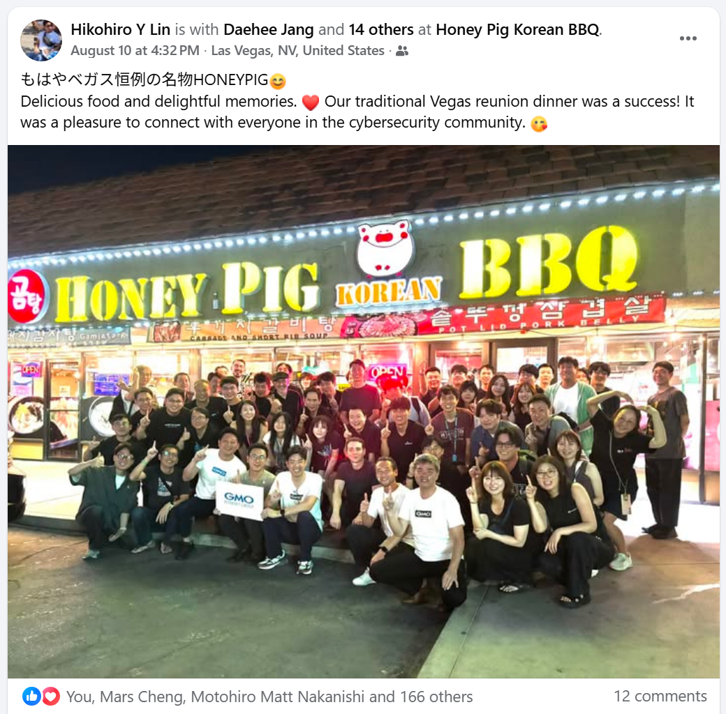 저녁에는 저희 교수님께서 GMO Ierae 분들로부터 저녁 식사 자리에 초대 받으셔서, 교수님 랩실 일원으로서 저녁 식사 자리에 참석했습니다. GMO Ierae의 히코히로 린상의 주최로 동아시아 출신의 DEF CON 컨퍼런스 참석자들이 모였습니다. 일본인 분들도 많이 계셨고, 중국, 대만, 홍콩 분들이 꽤 계셨습니다. 저는 영어도 가능하고 일본어도 가능해서 처음 뵙지만 이분저분 말씀 걸어보면서 네트워킹하고자 했습니다.